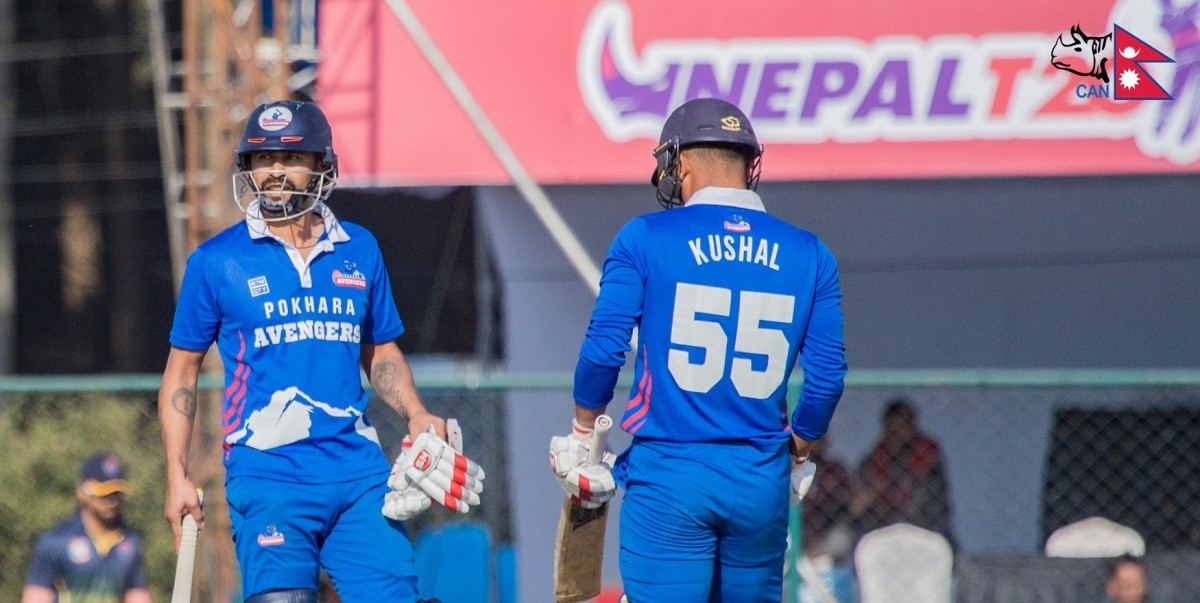 ओपनर अर्जुन साउद २२ बलमा १ चौका र २ छक्कासहित २५ रनमा आउट भए । कप्तान आन्दे्र म्याकार्थीले २१ तथा रोहित पौडेल ५ रनमा र पृथु बाँस्कोटा १५ रनमा आउट भए । पोखराका लागि कुशल मल्ल र शरद भेषवाकरले समान २/२ विकेट लिए ।