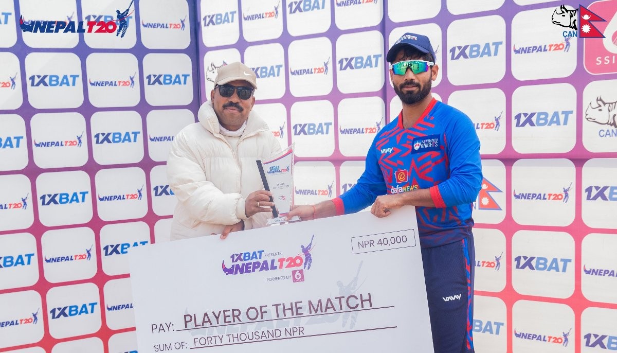 यस्तै, विवेक यादवले १२ र नन्दन यादवले अविजित ११ रन बनाउनुबाहेक अन्य खेलाडीले दोहोरो अंकमा रन बनाउन सकेनन् । ओपनर अर्जुन साउद १ रन, हुसेन तालत ८ रन, कप्तान रोहित पौडेल २ रन र राज नन्नन शून्यमा आउट भए ।
